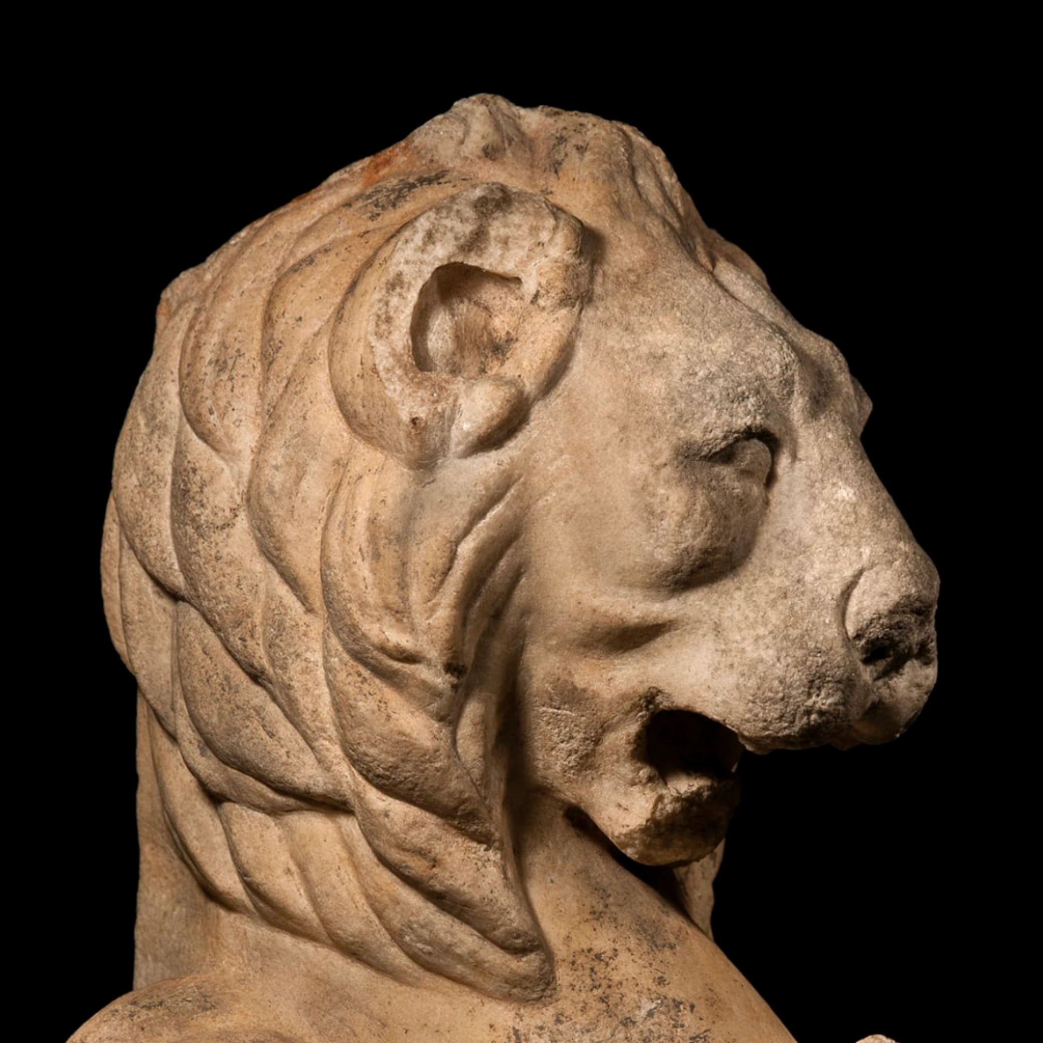 The piece is made from a single block of fine marble. You can see the detailed carving in the mane, the open jaws, and the muscles of the lion. There is a round hole between the shoulders where a horizontal bar once supported the tabletop. The back is flat because it was meant to be attached to the structure of a table. The marble has an aged surface that forms naturally over many centuries.