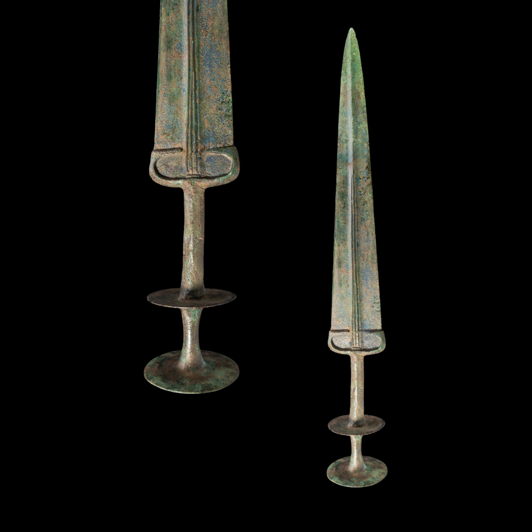 This Elamite bronze sword features a long triangular blade strengthened by a pronounced central midrib and subtle grooves running along its length, designed to provide both balance and structural integrity.