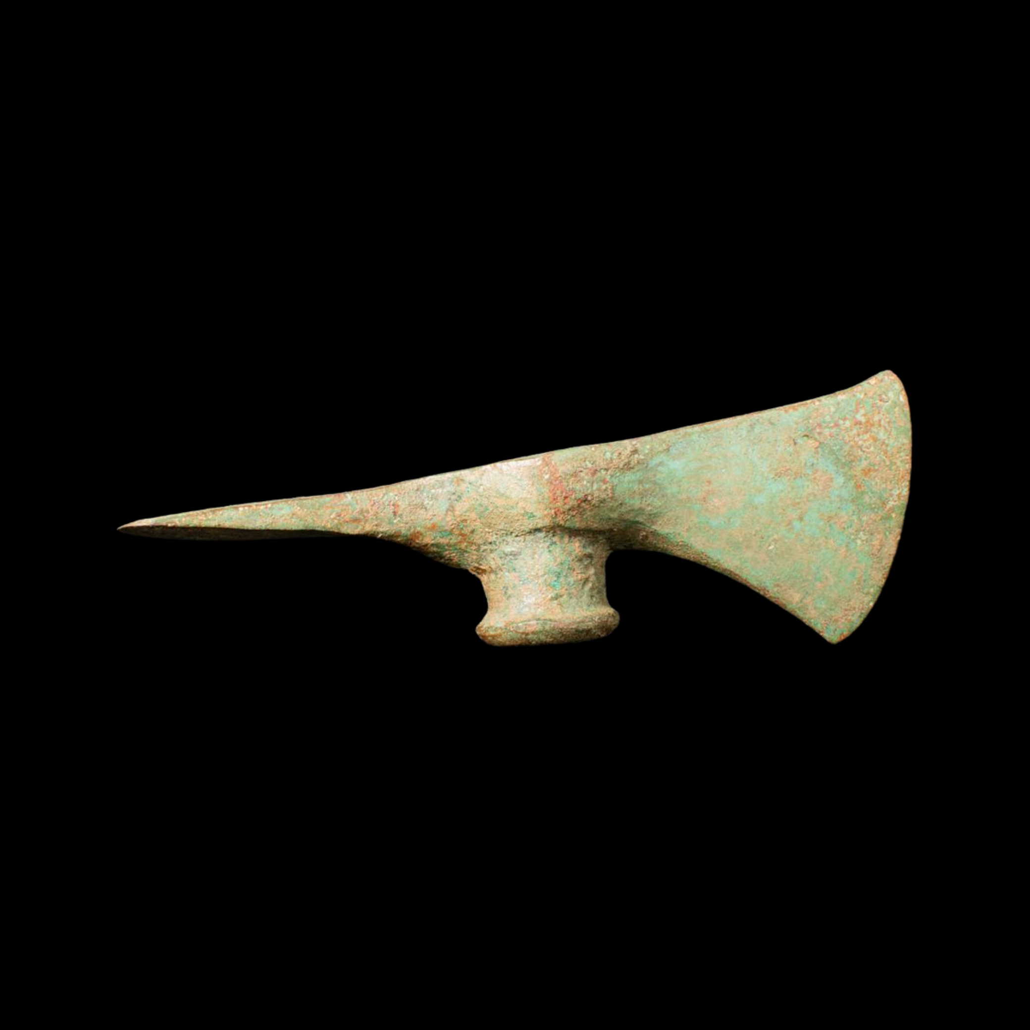 Such axe heads reflect the military and agrarian realities of early Iron Age Israel, when bronze weapons continued to circulate alongside emerging iron technology. The form allowed for secure hafting and effective use in close combat or as a working tool.