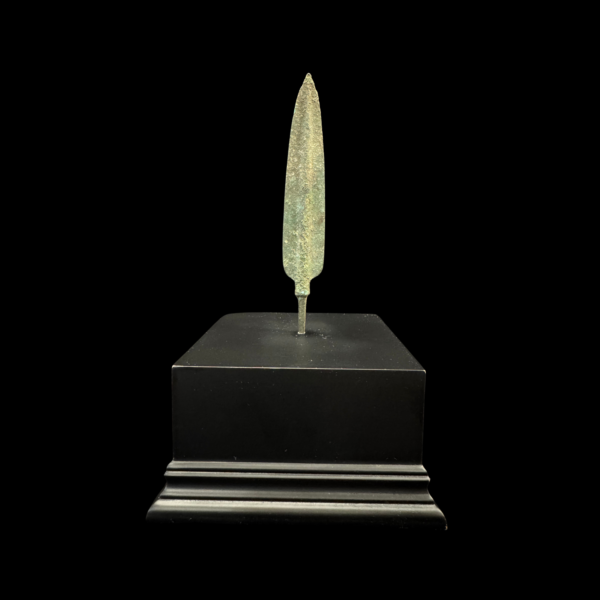 This slender bronze projectile dates to the 1st century AD and likely served as the tip of a Roman javelin (pilum) or thrusting spear. With its long, leaf-shaped blade and pronounced central ridge, it was designed for deep penetration and precision. The tapered tang ensured secure attachment to a wooden shaft, ideal for both throwing and close combat.